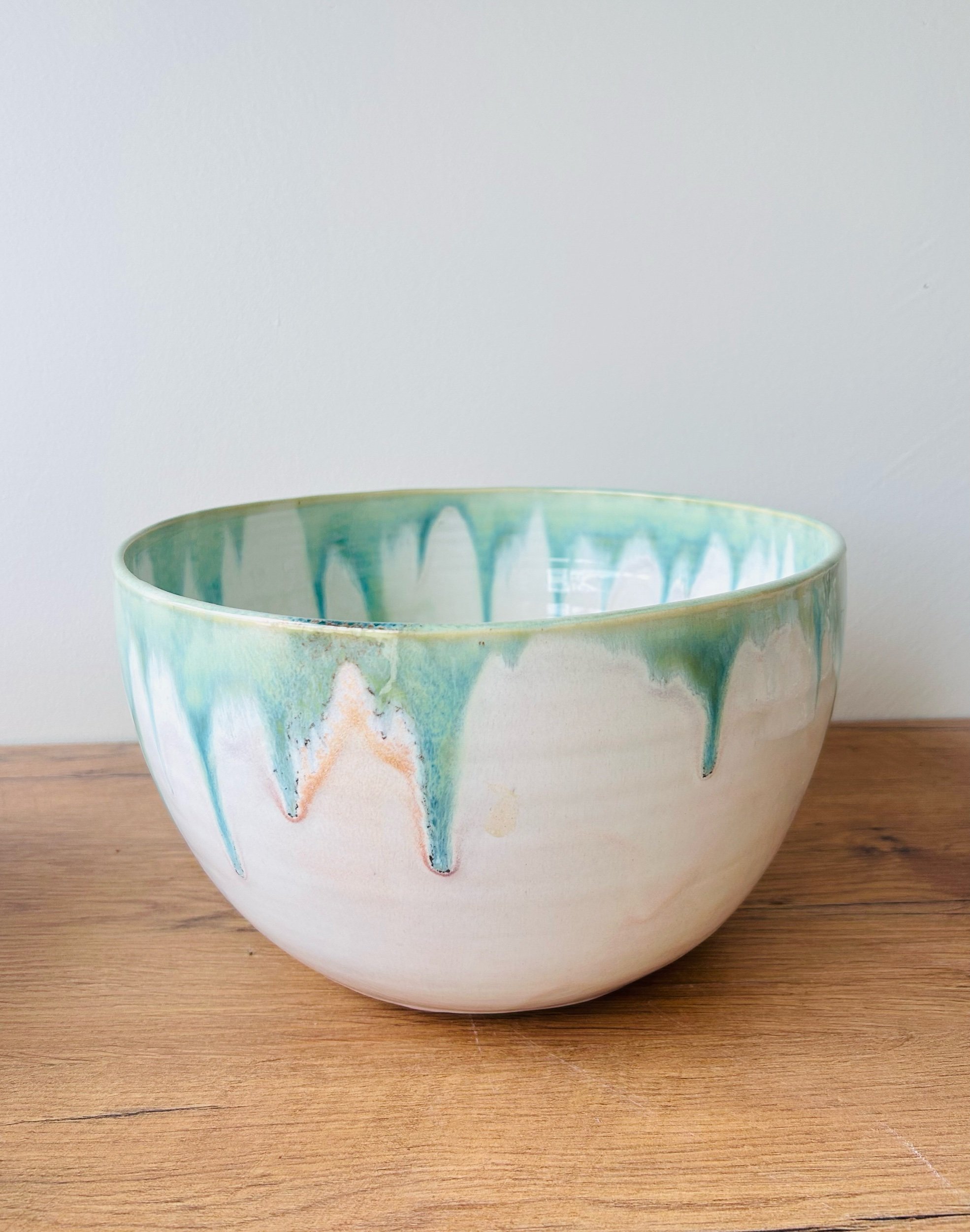 Lovely large glossy white bowl with green drippy edge. Suitable as a fruit bowl or large salad bowl. Stunning as a decorative piece also. 28cm diameter. 16 cm high.